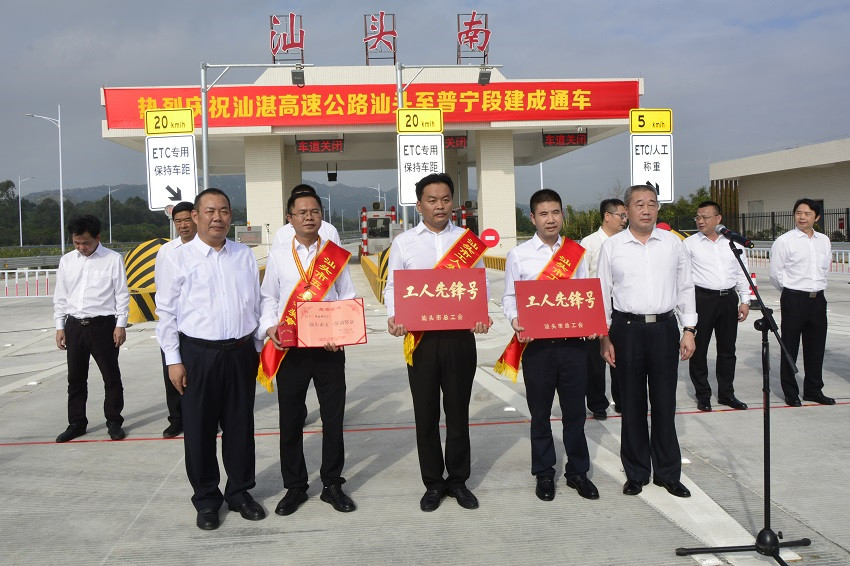 上午10:00,廣東汕湛高速公路汕頭至普寧段通車慰問活動在汕頭南收費站入口舉行,活動全面展示了中國中鐵各參建單位的建設歷程和成果,廣東省交通運輸廳、汕頭市總工會向參與項目的中國中鐵建設者致以最誠摯的慰問,并頒發(fā)了先進集體、先進個人獎牌獎章。