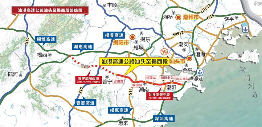廣東汕湛高速公路汕頭至揭西段是廣東省高速公路網(wǎng)中汕頭至湛江高速公路的起點段,是服務粵東地區(qū)出行、補齊區(qū)域發(fā)展短板的重要交通工程。開通的廣東汕湛高速公路汕頭至普寧占隴段主線長約49公里(汕頭段全線約43.5公里),包含濱海、潮陽北、銅盂、峽山、占隴5個互通,分別與沈海高速、牛田洋快速通道、潮汕環(huán)線高速、揭惠高速以及河浦大道、省道234公路、省道237公路、北環(huán)大道等實現(xiàn)聯(lián)通,同步開通包括汕頭境內(nèi)的汕頭南、潮陽北、銅盂、峽山收費站和揭陽境內(nèi)的占隴收費站。