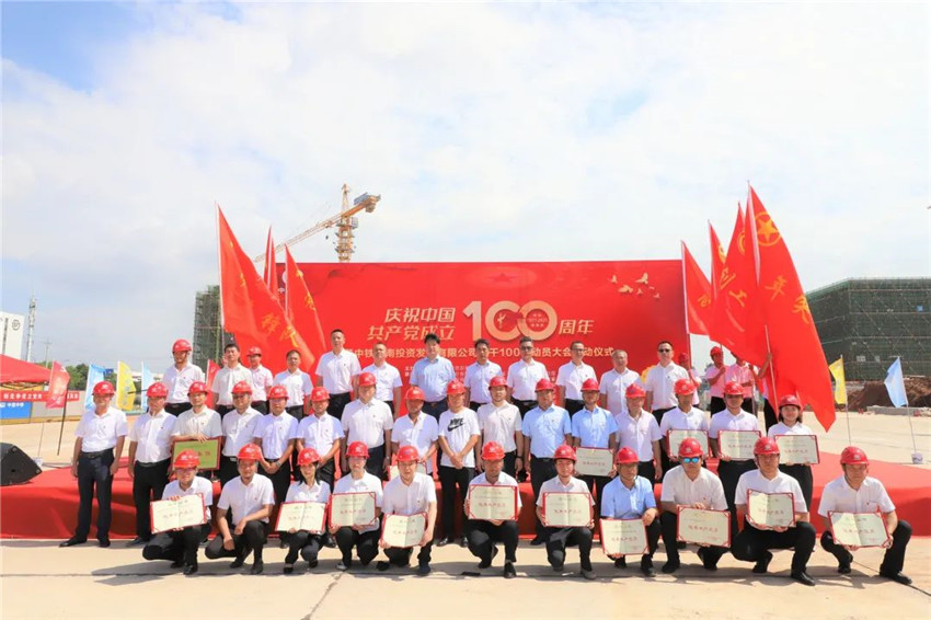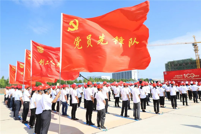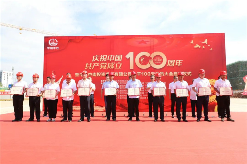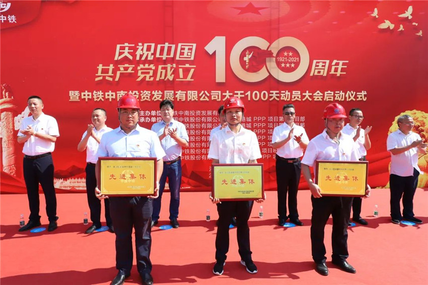 大會表彰了先進集體和個人,重溫了入黨誓詞,對“大干100天”專項勞動競賽進行了動員和部署,參建項目代表進行了表態發言,對黨員先鋒隊、工人先鋒號、青年先鋒崗進行了授旗。